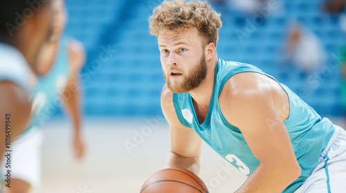 Young athlete playing basketball with focus and determination wearing blue sports jersey on an indoor court surrounded by teammates