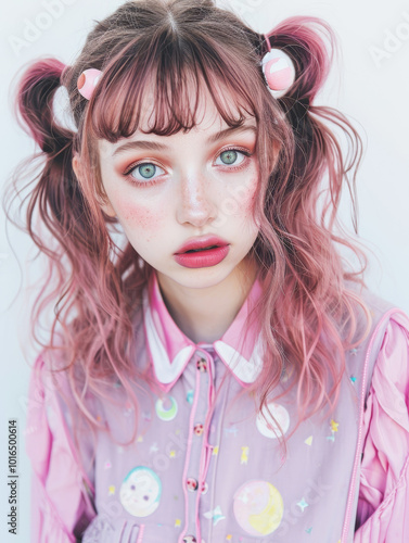 Charming young woman in a kawaii outfit with pigtails and pink accents exudes a playful and whimsical style. Her vibrant fashion captures the essence of youthful girlish charm.