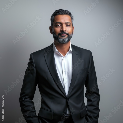 Confident Indian man in his 40s with short black hair, wearing a suit against a neutral background