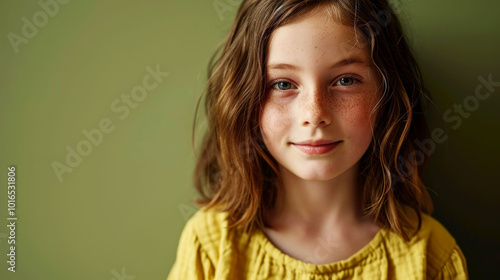 Serene chestnut-haired child dressed in yellow, evoking calmness and childhood