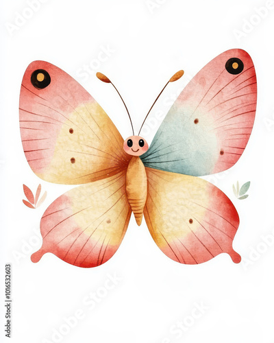 Cute watercolor butterfly cartoon illustration with happy expression, perfect for nursery or children's room decor