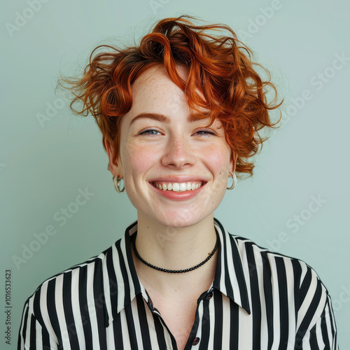 Portrait of smiling young person with curly chestnut hair, wearing striped shirt and earrings, expressing joy and confidence against a soft green background.