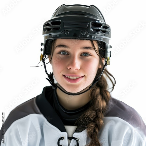 Portrait of a cheerful young female ice hockey player with equipment
