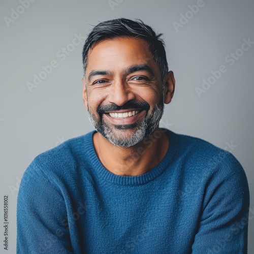 Portrait of a joyful Indian man in his 40s with a bright smile and a stylish beard