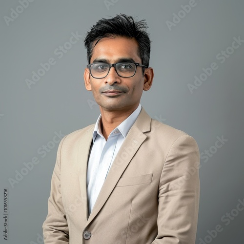 Confident Indian businessman in his 40s wearing glasses and beige suit looking forward against gray background