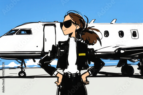 Confident female pilot in her 40s standing proudly in front of a private jet on a sunny day