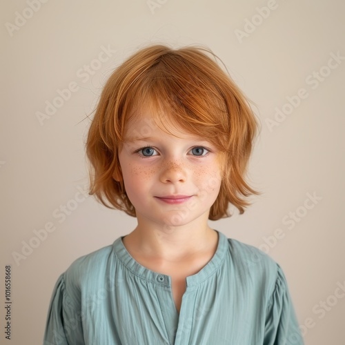 Radiant child with amber hair and freckles wearing a blue shirt, exuding innocence and warmth in a portrait setting