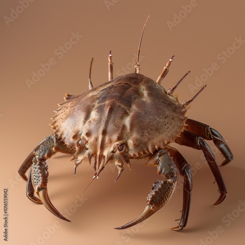 Studio portrait of a horseshoe crab showcasing its intricate shell and pincers on a neutral background