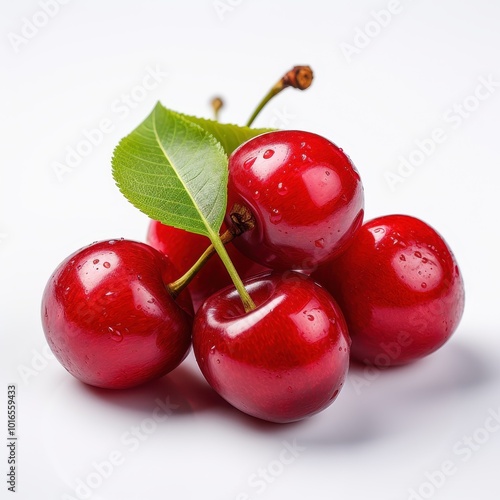 Juicy fresh cherries with water droplets on a white background