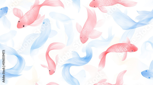 Seamless watercolor pattern of koi fish with gentle ink brush waves