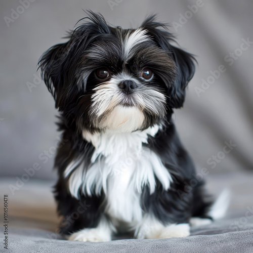 Adorable Shih Tzu puppy with fluffy black and white fur sitting on a soft gray blanket in a cozy home setting