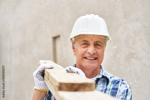 Senior male carpenter wearing workwear with planks on shoulder at construction site