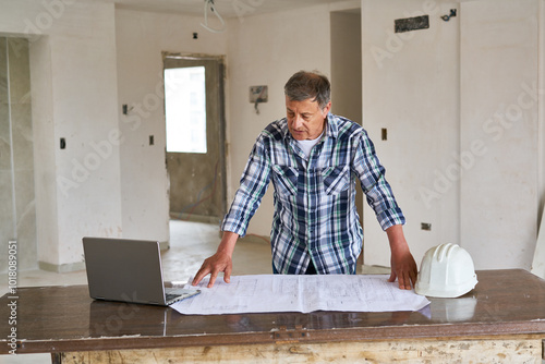 Senior male architect examining design by laptop and hardhat at desk in incomplete house