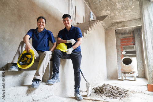 Full length portrait of smiling young male and female masons sitting on incomplete staircase in corridor at construction site