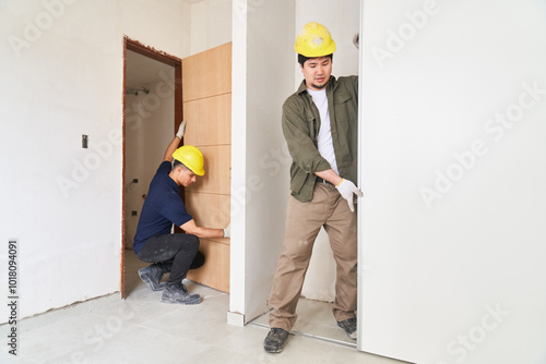 Young male construction workers wearing safety workwear installing doors at incomplete house