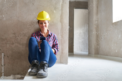 Smiling young female worker using smart phone while sitting against wall at construction site during break