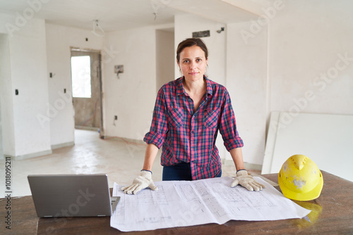 Portrait of confident young female architect standing with blueprint and laptop at desk in incomplete house