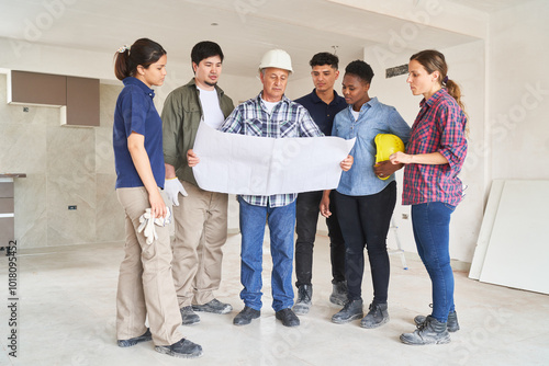 Team of contractor meeting over blueprint with coworkers discussing work at incomplete house