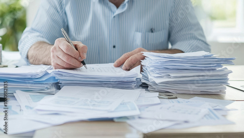 Professional working diligently at a desk filled with documents showcasing focus and productivity