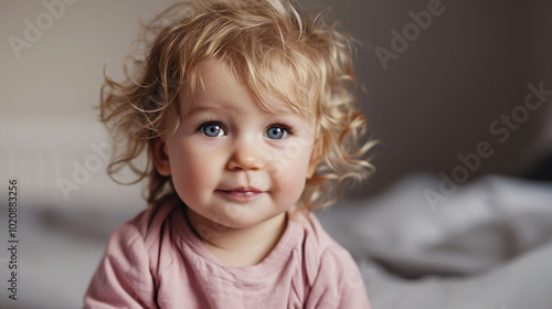 Joyous blonde toddler girl in a pink shirt against a soft background