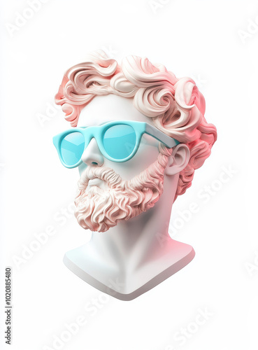 Colorful Greek statue with pink sunglasses showcasing a modern pop art style, featuring pastel tones of blue and yellow hair. Ideal for contemporary and playful art concepts.