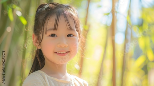 Smiling Japanese boy enjoying a sunny day outside, radiating joy and innocence