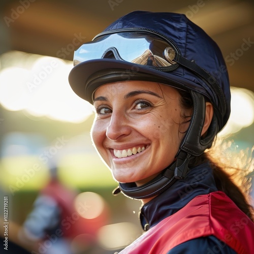 Female jockey in racing gear enjoying a sunny day at the horse track