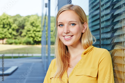Junge blonde Geschäftsfrau vor Büro