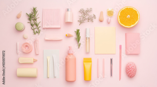 A beautifully composed flat lay of pastel colored skincare items, stationery, natural elements, and a fresh orange slice on a soft pink background conveys a sense of calm and minimalism.