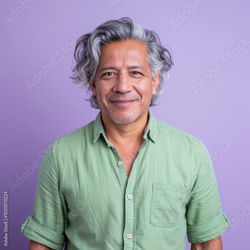 Portrait of a radiant man in his 50s with silver wavy hair wearing a green shirt against a purple background
