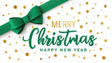 Merry Christmas And Happy New Year Greeting Card With Green Ribbon Bow And Gold Stars On White Background For Holiday Seasonal
