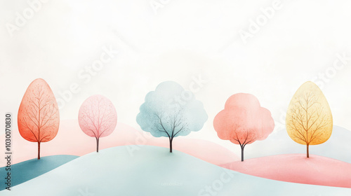 Colorful watercolor trees illustrating changing seasons in a minimalist art style