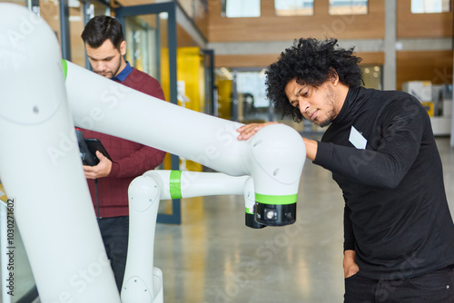 Engineers examining robotic gripper arm during industrial automation training session