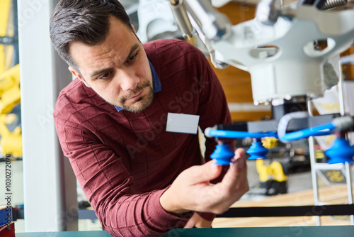 Engineer inspecting gripper arm of a robot in a modern robotics lab
