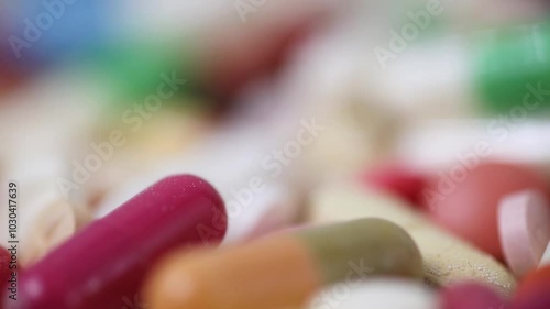 Closeup static shot of rotating pile of colourful medicine pills