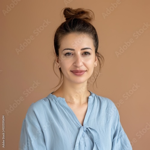 Professional Turkish businesswoman in her 40s with a confident smile and casual hairstyle against a neutral background
