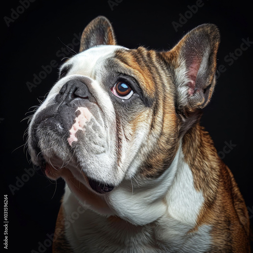 Portrait of a charming bulldog captured in a studio with a vibrant gradient background showcasing its expressive features and regal demeanor