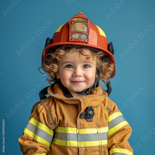 Charming child dressed as a police officer standing confidently against a vibrant blue background with a joyous expression.