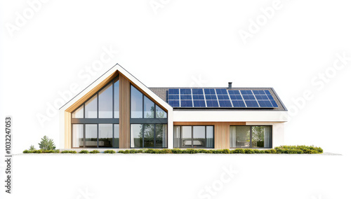 Modern suburban house with solar panels on a sunny day promoting sustainable living