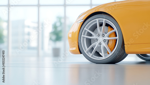 Close-up view of the front wheel and fender of a vibrant orange sports car in a modern showroom setting