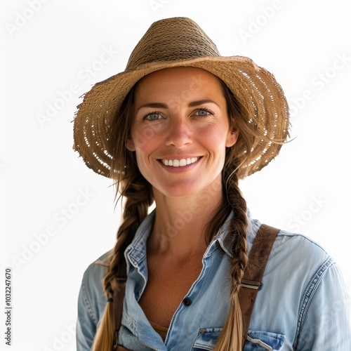 Portrait of a cheerful female farmer wearing a straw hat and denim shirt