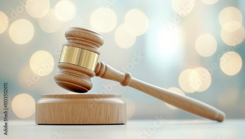 Wooden gavel resting on a stand with soft blurred bokeh lights