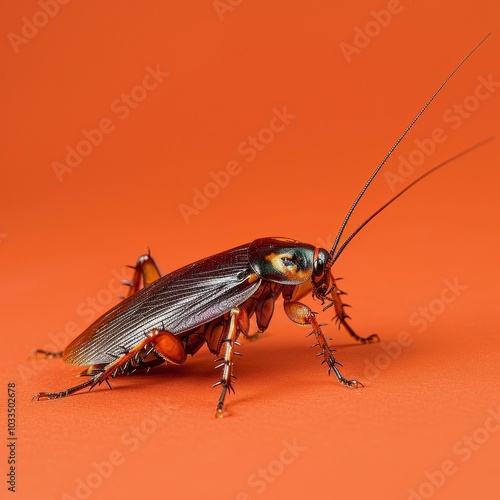 Close-up portrait of a cockroach in a professional studio setting on an orange background showcasing intricate details