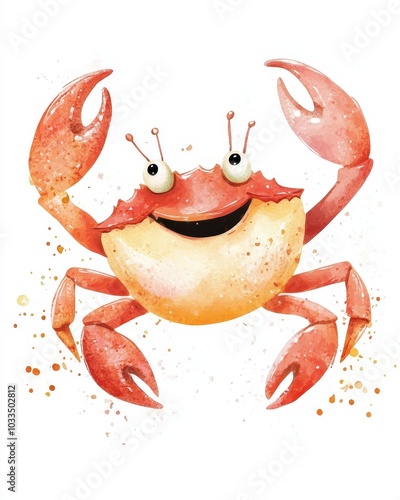 Cute and happy crab cartoon in watercolor style for nursery decor, featuring a vibrant orange and red design that brings joy and a playful spirit to any environment.