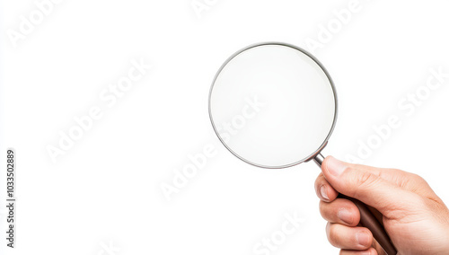 Hand holding a magnifying glass isolated on a white background, symbolizing focus and investigation