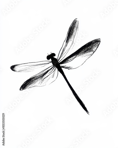 Minimalistic stick figure drawing of a dragonfly in black and white, showcasing elegant and delicate wing structure in a simplistic artistic style.