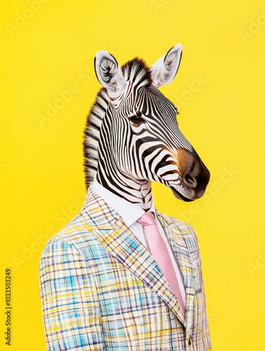 Stylish zebra portrait in haute couture fashion against a vibrant yellow backdrop highlighting humor and style in animal depiction