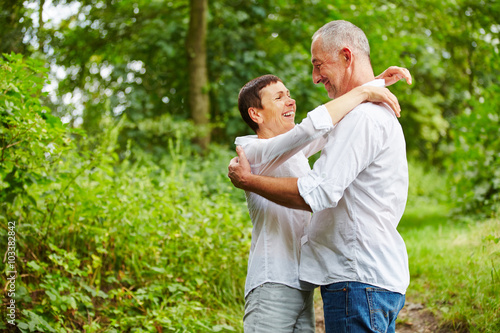 Glückliche Paare Senioren im Garten vom Seniorenheim
