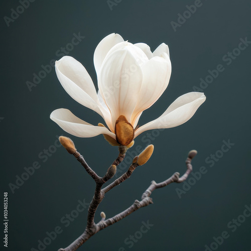 Elegant magnolia flower in a professional studio shot with soft light and a calming background, showcasing its delicate petals and exquisite beauty.