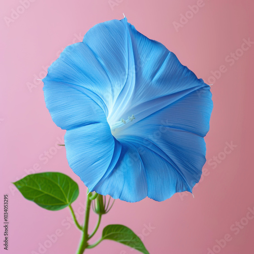 Studio shot of a vibrant Morning Glory flower with delicate blue petals against a soft pink background, showcasing its natural elegance and beauty in a professional photography setting.